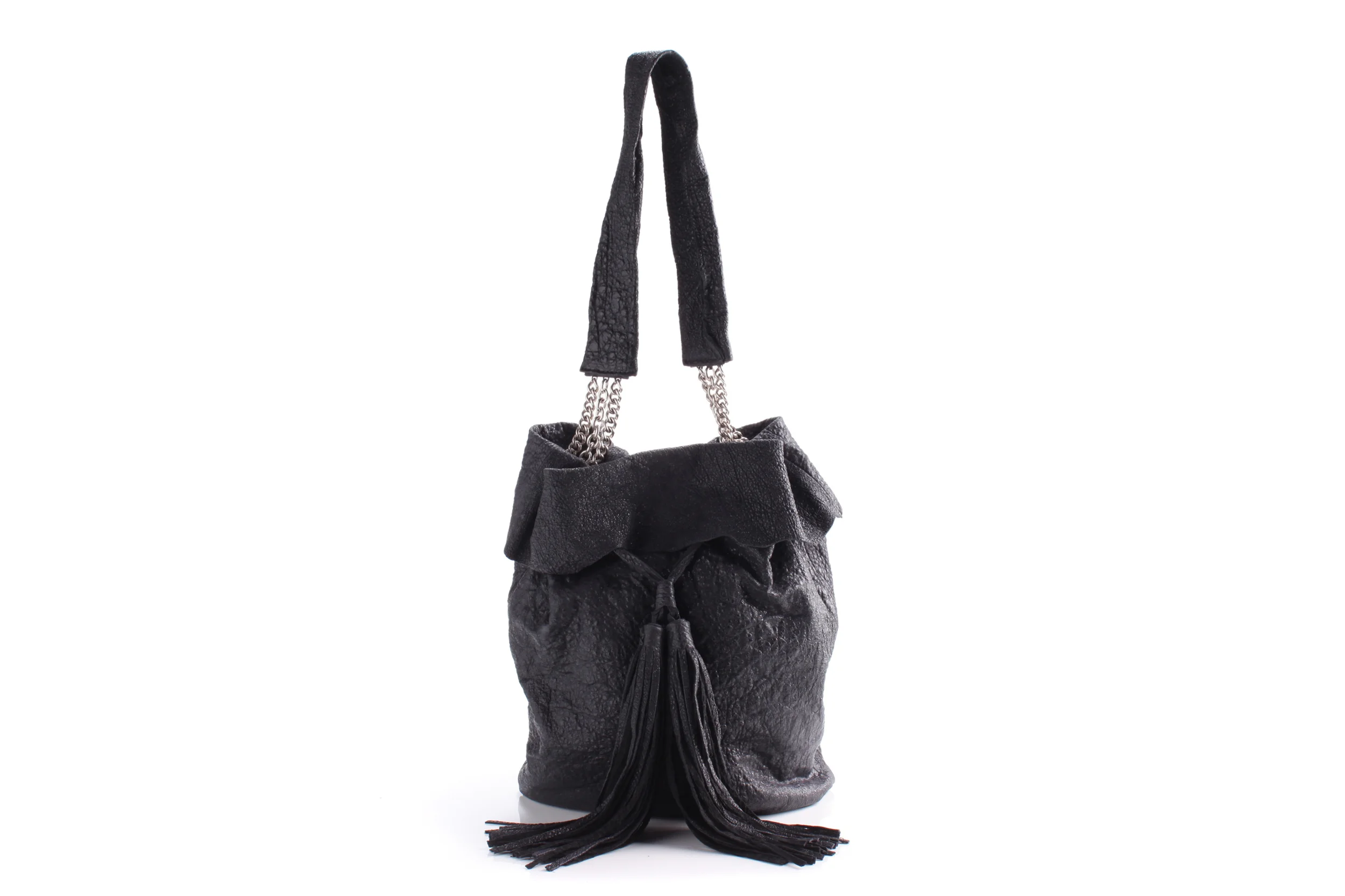 Supple leather drawstring bucket bag featuring handmade tassel closures. Signature Shoulder strap with chain detailing. Naturally imperfect, raw-finished top flap, magnetic closure.